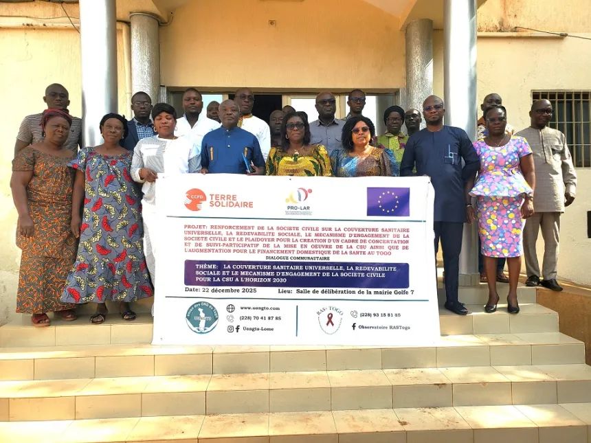 (Société Civile Médias) – Le consortium composé de l’Union des ONG du Togo (UONGTO) et du Réseau des Associations des Personnes vivant avec le VIH/SIDA (RAS+ TOGO) poursuit ses actions de mobilisation en faveur d’une meilleure compréhension et d’une mise en œuvre efficace de la Couverture Sanitaire Universelle (CSU). Après avoir, il y a quelques semaines, renforcé les capacités des organisations de la société civile sur les concepts clés de la CSU, la redevabilité sociale et le plaidoyer pour l’augmentation du financement national de la santé, le consortium a lancé, le lundi 22 décembre 2025, un dialogue communautaire destiné aux leaders d’opinion et aux conseillers municipaux. Cette initiative, qui a débuté dans la commune de Golfe 7 (Afla-Sagbado), est centrée sur le thème : « Couverture sanitaire universelle, redevabilité sociale et mécanisme d’engagement de la société civile pour la CSU à l’horizon 2030 ».