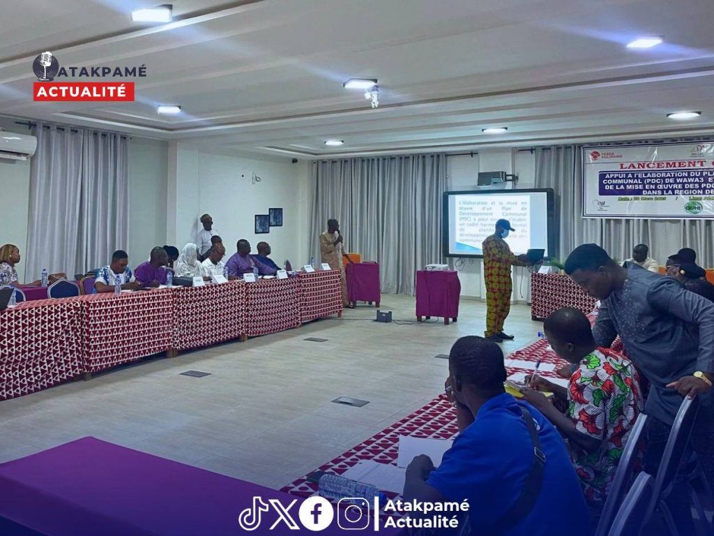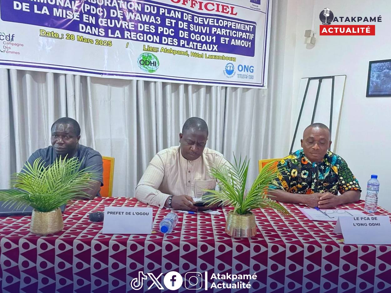 Le vendredi 28 mars 2025, l’Hôtel Luxembourg à Atakpamé a servi de cadre au lancement officiel du « 𝙋𝙧𝙤𝙟𝙚𝙩 𝙙’𝘼𝙥𝙥𝙪𝙞 𝙖 𝙡’𝙀𝙡𝙖𝙗𝙤𝙧𝙖𝙩𝙞𝙤𝙣 𝙙𝙪 𝙋𝙡𝙖𝙣 𝙙𝙚 𝘿𝙚𝙫𝙚𝙡𝙤𝙥𝙥𝙚𝙢𝙚𝙣𝙩 𝘾𝙤𝙢𝙢𝙪𝙣𝙖𝙡 (𝙋𝘿𝘾) 𝙙𝙚 𝙒𝙖𝙬𝙖 𝟯 𝙚𝙩 𝙙𝙚 𝙎𝙪𝙞𝙫𝙞 𝙋𝙖𝙧𝙩𝙞𝙘𝙞𝙥𝙖𝙩𝙞𝙛 𝙙𝙚 𝙡𝙖 𝙈𝙞𝙨𝙚 𝙚𝙣 𝙤𝙚𝙪𝙫𝙧𝙚 𝙙𝙚𝙨 𝙋𝘿𝘾 𝙙𝙚 𝙊𝙜𝙤𝙪 𝟭 𝙚𝙩 𝘼𝙢𝙤𝙪 𝟭 ». Porté par un consortium d’organisations de la société civile, piloté par 𝙊𝘿𝙃𝙄 𝙚𝙣 𝙘𝙤𝙡𝙡𝙖𝙗𝙤𝙧𝙖𝙩𝙞𝙤𝙣 𝙖𝙫𝙚𝙘 𝘾𝘿𝙁 𝙚𝙩 𝙏𝙀𝙏𝙀𝙇𝙀𝙎𝙏𝘼𝙄 𝙏𝙤𝙜𝙤 , ce projet bénéficie du cofinancement de 𝙡’ Union européenne 𝙚𝙩 𝙙𝙚 𝘾𝘾𝙁𝘿 𝙏𝙚𝙧𝙧𝙚 𝙎𝙤𝙡𝙞𝙙𝙖𝙞𝙧𝙚. Il s’inscrit dans une dynamique de renforcement de la gouvernance locale en dotant les communes d’outils de planification stratégique et de mécanismes de participation citoyenne.